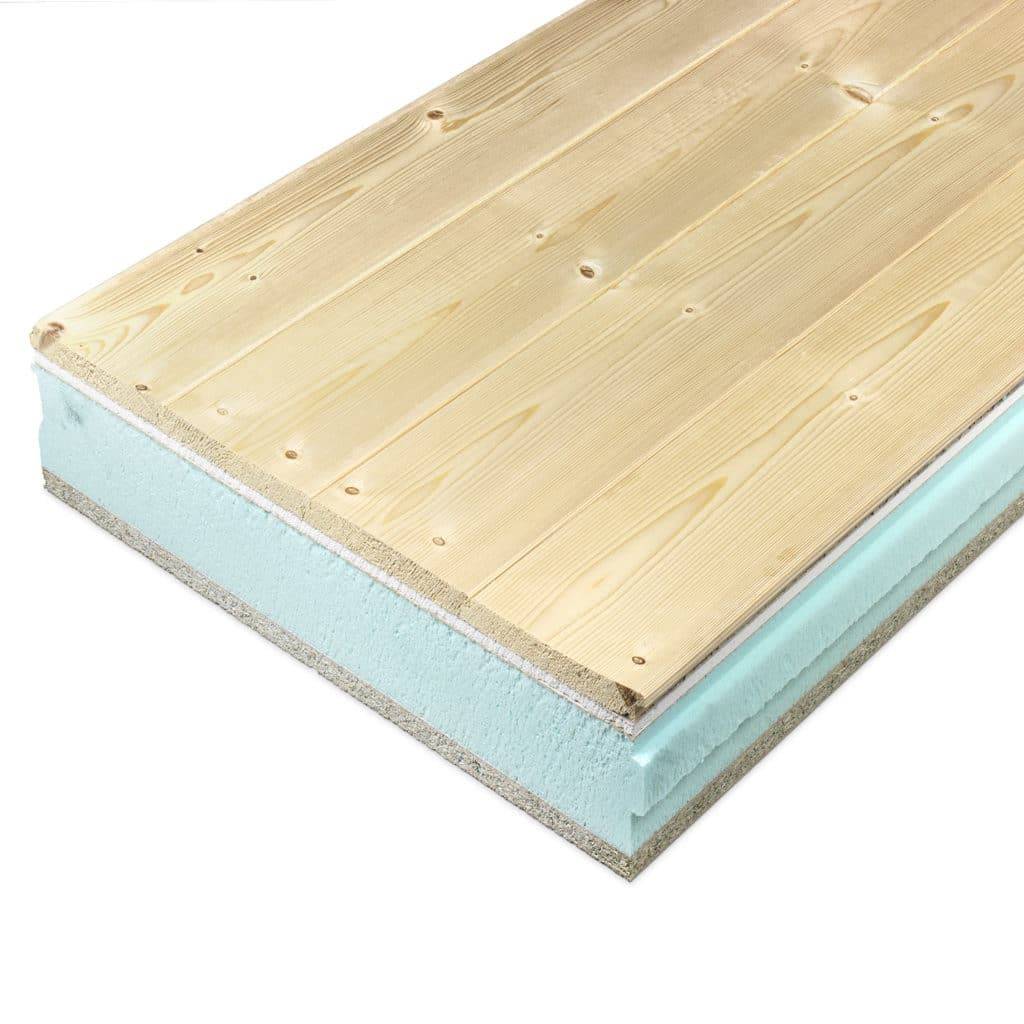 El panell sandvitx està compost per una capa exterior hidròfuga, un nucli aïllant de poliestirè i un acabat interior decoratiu amb diverses fustes.